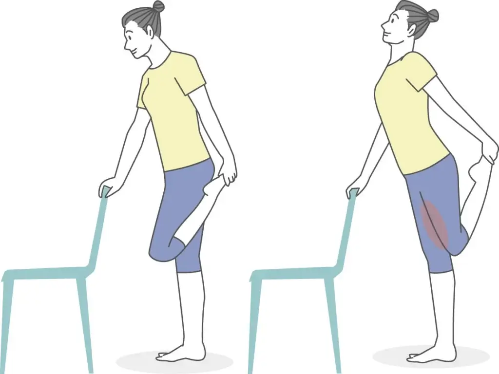2.もう片手で片足を持って後ろに引き、太もも前が伸びる位置を探します。