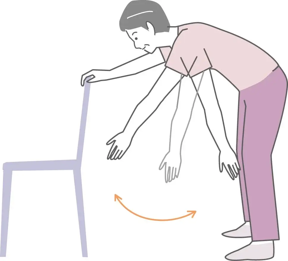1.イスの背もたれにつかまり、足を肩幅に開き、体を少し前に倒す