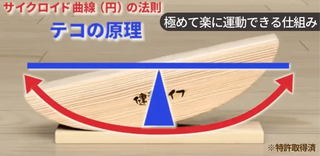 あしふみ健幸ライフは、てこの原理を活かした半円構造になっており、わずかな力でも自然に足踏みができる設計です。